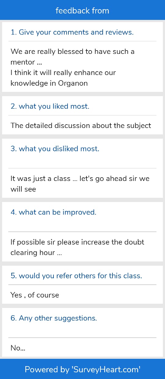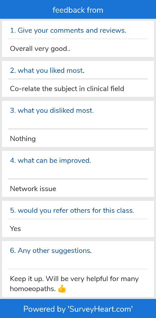 In this class room we will cover entire aphorisms of organon of medicine along with fundam entals of Homoeopathy. With once in a week doubt clearing classes and clinical orientation. This is a three months course, best for those who want to have a grasp on subject and have clinical orientation from view point of a Homoeopath.